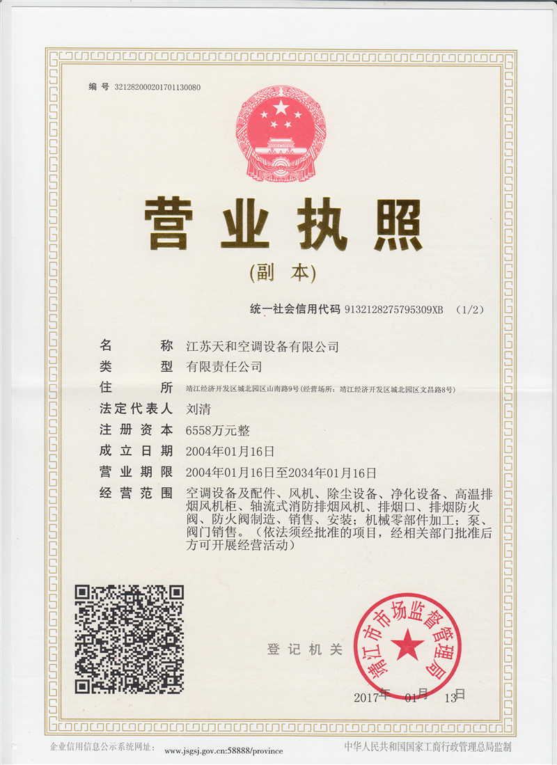 ?江蘇天和空調設備有限公司(原靖江市天和空調設備公司)創建于2004年,位于江蘇省靖江市城北工業園區9,環境幽雅,交通便利。