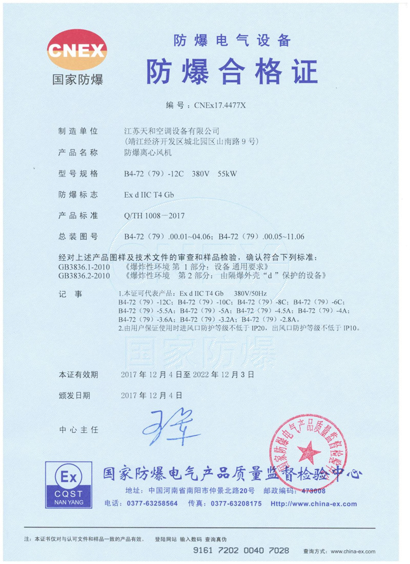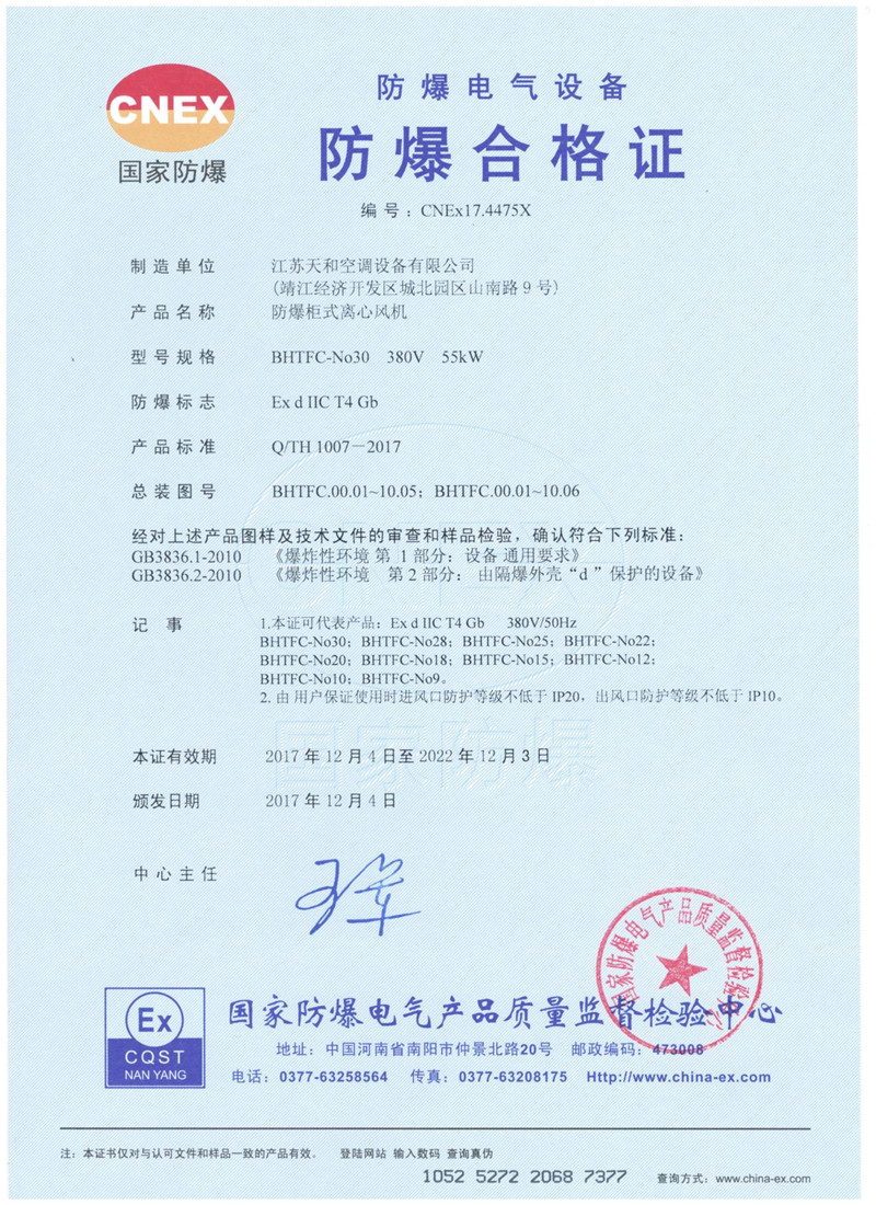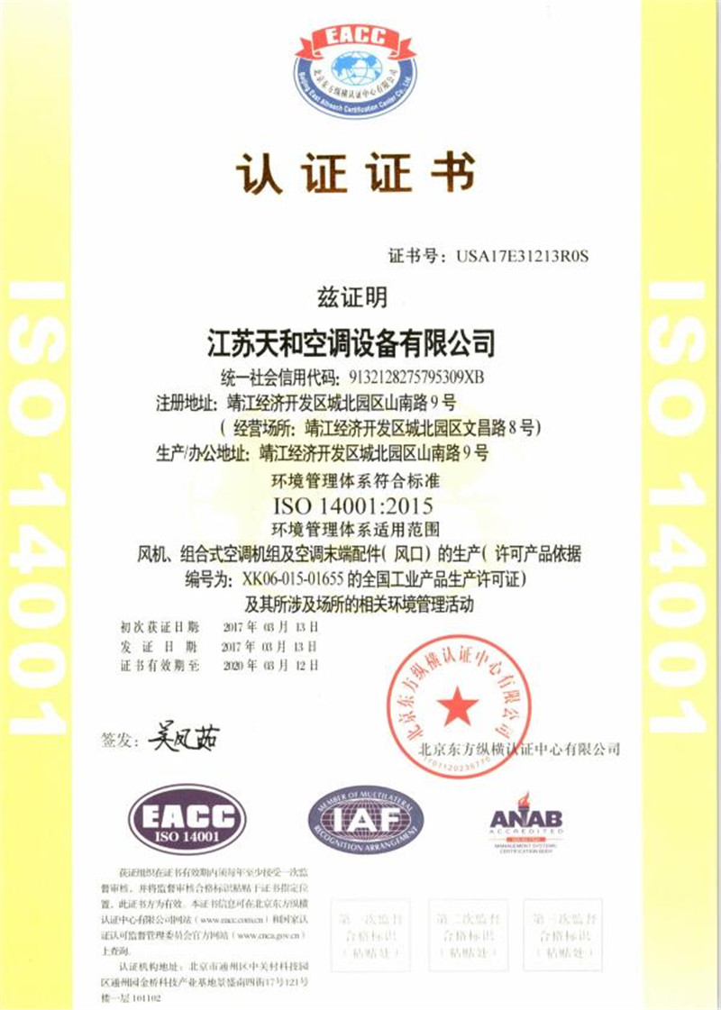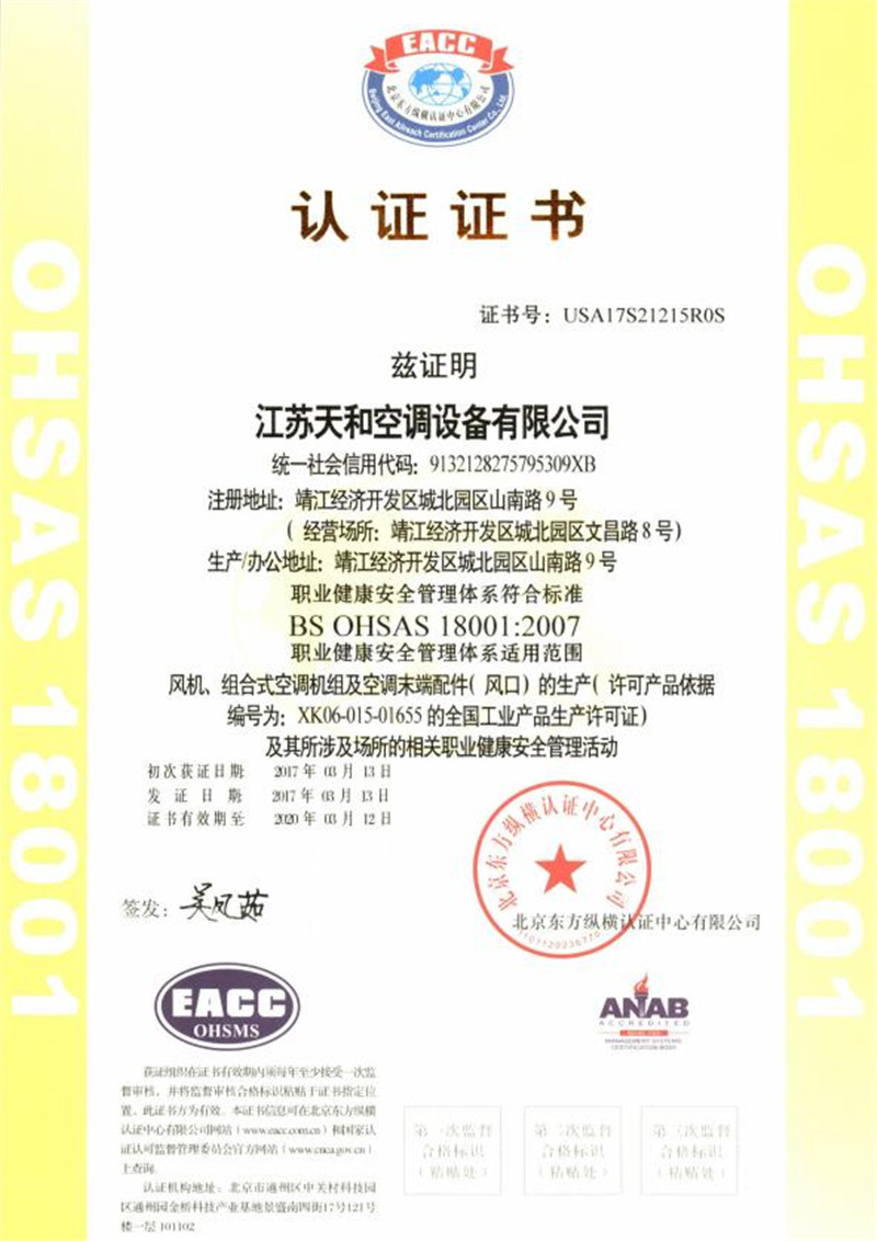 ?江蘇天和空調設備有限公司生產的主要產品有組合式空氣處理器、變風量空氣處理機、消防高溫排煙風機、消防高溫柜式離心風機、全鋁制屋頂風機、玻璃鋼屋頂風機、商用(家用)PM2.5全熱交換器、混流風機,斜流風機,離心管道風機,誘導風機及各種國標離心風機等通風設備、空調末端有消防3C防火閥,排煙防火閥,多葉排煙口,消聲器、散流器、風口、調節閥等產品。其中消防產品已通過國家消防裝備質量監督檢驗中心的檢驗,并可上國家公安消防網查閱檢測結果。
