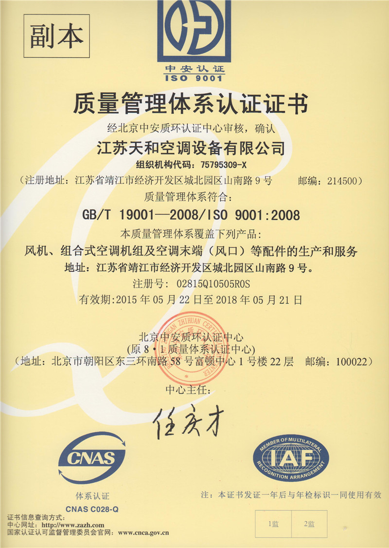 ?公司技術力量雄厚,生產設備先進,檢測設備齊全,擁有自己的風機、空調、空調配件專業生產車間,并擁有專業設備80臺套,專業技術人員120人,是江蘇省消防協會會員單位,并通過了ISO9001-2000質量管理體系認證。